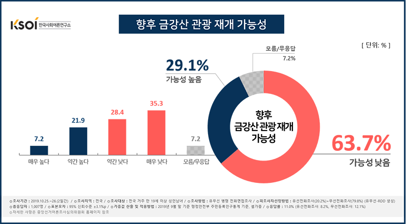 한국사회여론연구소(KSOI)가 지난 10월 25일과 26일 이틀에 걸쳐 전국 만 19세 이상 성인 남녀 1,007명을 대상으로 실시한 ‘향후 금강산 관광 재개 가능성’에 대한 여론조사에서 재개 ‘가능성 낮음’의견이 63.7%로 ‘가능성 높음’(29.1%) 의견보다 높은 것으로 나타났다. 이는 현재 교착상태인 북미대화, 경색된 남북관계 상황 속에서 남북협력사업의 진전이 힘들 것이라고 우리 국민들은 인식하고 있다고 판단된다.