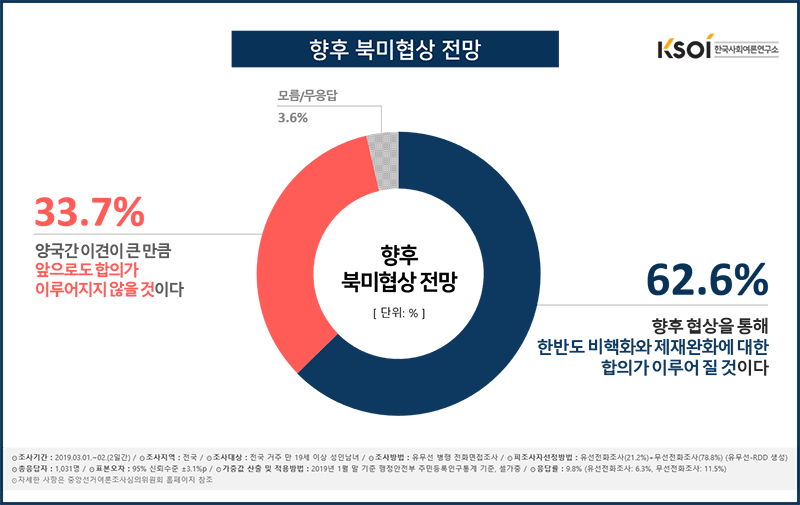 이번 2월 정례조사는 북미정상회담 특집으로 전국 만 19세 이상 성인 남녀 1031명을 대상으로 북미정상회담 직후인 지난 3월 1일과 2일 이틀에 걸쳐 유무선 병행 (무선78.8%, 유선21.2%)전화면접조사 방식으로 실시했으며, 표본오차는 95% 신뢰수준에서 ±3.1%p수준, 응답률은 9.8%(유선전화면접 6.3%, 무선전화면접 11.5%)다. 2019년 1월 말 기준 행정안전부 주민등록 인구를 기준으로 성, 지역, 연령별 가중치를 적용했다. 보다 자세한 사항은 중앙선거여론조사심의위원회 홈페이지(www.nesdc.go.kr)와 한국사회여론연구소 홈페이지(www.ksoi.org)를 참조하면 된다.