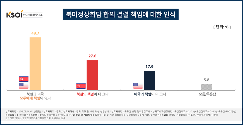 한국사회여론연구소(KSOI)가 북미정상회담 직후인 지난 3월 1일과 2일 이틀에 걸려 전국 만19세 이상 성인남여 1,031명을 대상으로 실시한 2월 정례조사에서 이번 북미정상회담의 합의 결렬의 책임이 누구에게 있냐는 질문에 ‘북한과 미국 모두에게 책임이 있다’는 응답이 48.7%로 가장 높게 나타났다.