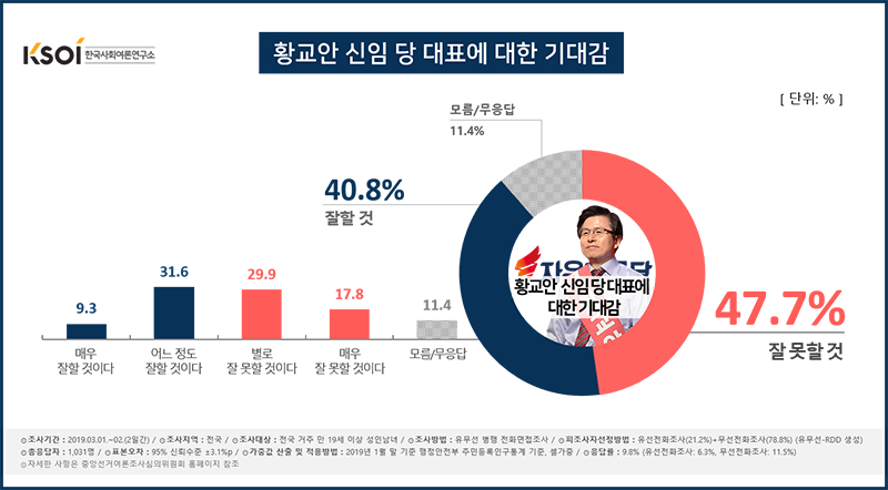 한국사회여론연구소가 지난 3월 1일과 2일 이틀에 걸쳐 전국 만 19세 이상 성인남여 1,031명을 대상으로 실시한 2월 정례조사에서‘황교안 신임 당 대표가 앞으로 당 대표로서의 역할을 잘 수행할 것이냐’는 질문에 응답자의 47.7%가 ‘잘 못할 것’이라고 답해 황교안 신임 당 대표에 거는 기대감이 다소 낮은 것으로 나타났다.