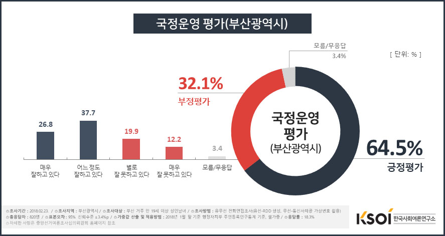 문재인 대통령의 국정운영에 대하여 부산광역시 시민 64.5%는 ‘잘하고 있다’(‘매우 잘하고 있다’ 26.8% + ‘어느 정도 잘 하고 있다’ 37.7%)고 답했으며, ‘잘 못하고 있다’(‘별로 잘 못하고 있다’ 19.9% + ‘매우 잘 못하고 있다’ 12.2%)는 응답은 32.1%였다.