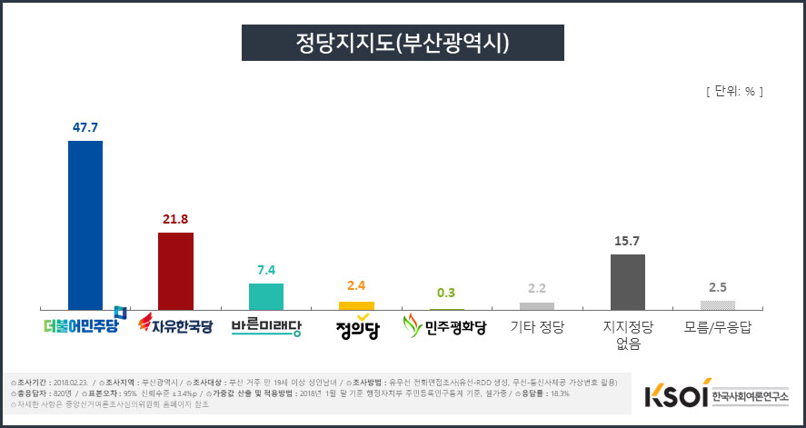 이번 여론조사는 한국사회여론연구소(KSOI/http://www.ksoi.org)의 지방선거 기획특집 ‘주요 격전지 여론조사’로 부산광역시 거주 만 19세이상 성인 남녀 820명을 대상으로 2월 23일 부산광역시 선거관리위원회로부터 발급받은 휴대전화 가상번호(안심번호)(79.8%)와 유선전화(RDD/20.2%)를 이용해 전화면접조사 방식으로 실시했으며, 표본오차는 95% 신뢰수준에서 ±3.4%p수준이며, 응답률은 18.3%(유선전화면접 16.6%, 무선전화면접 18.8%)다. 2018년 1월 말 기준 행정자치부 주민등록 인구를 기준으로 성, 지역, 연령별 가중치를 적용했다. 보다 자세한 사항은 중앙선거여론조사심의위원회 홈페이지(www.nesdc.go.kr)를 참조하면 된다.