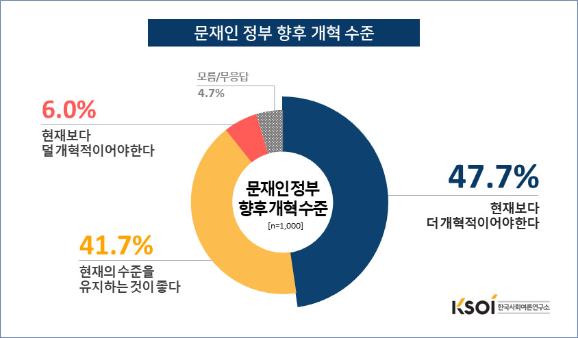 한국사회여론연구소가 실시한 이번 여론조사에서 문재인정부의 향후 개혁 수준을 묻는 질문에 대해 응답자의 47.7%가 ‘현재보다 더 개혁적이어야 한다’고 답했으며, ‘현재의 수준을 유지하는 것이 좋다’는 의견도 41.7%로 나타나 개혁에 대한 열망이 여전히 높은 것으로 조사되었다.