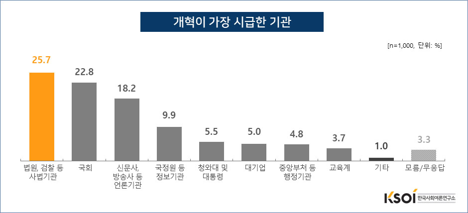 한국사회여론연구소(KSOI / www.ksoi.org)가 지난 8월 18일~ 19일 이틀에 걸쳐 전국 유권자 1018명을 대상으로 실시한 8월 정례여론조사에서 ‘국민의 신뢰회복을 위해 개혁이 가장 시급한 기관’을 묻는 질문에 ‘법원, 검찰 등 사법기관’의 개혁이 시급하다는 의견이 25.7%로 가장 높게 나타났다.