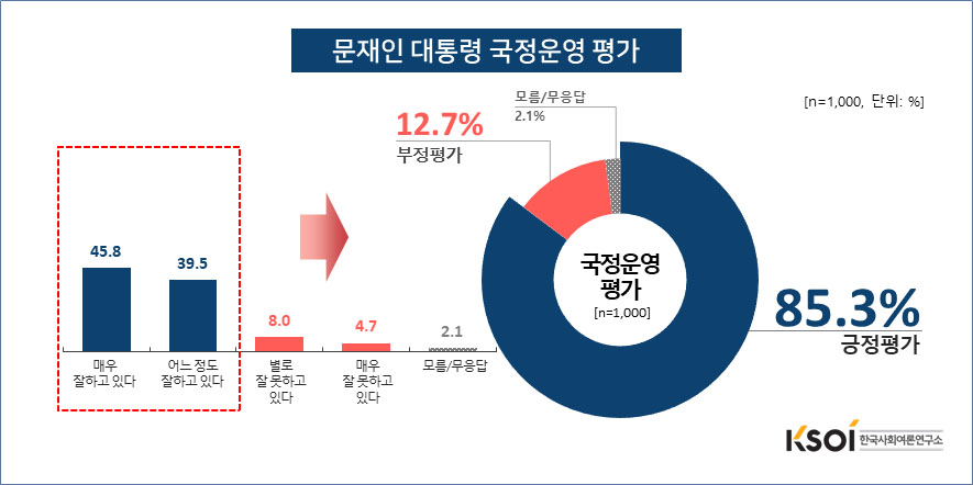 ‘잘 하고 있다’85.3%, 대통령의 국정운영에 대해 긍정평가 매우 높아