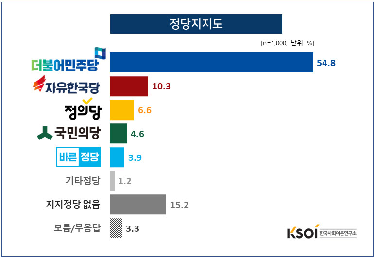 더불어민주당, 2.6%P 상승한 54.8%로 정당지지도 1위 지속