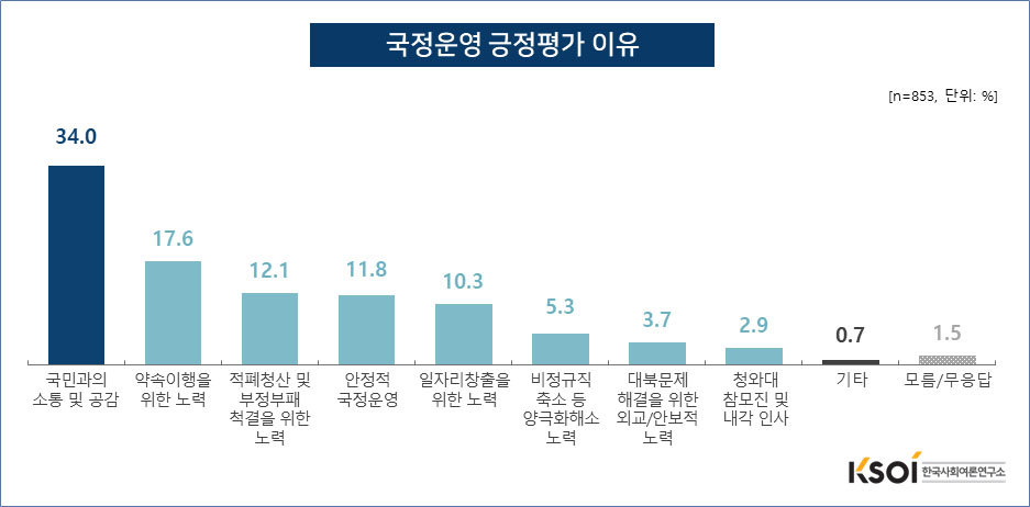 문재인 대통령의 국정운영 ‘긍정 평가층’(853명)을 대상으로 문재인 대통령이 국정운영을 잘하고 있다고 생각하는 이유에 대해 물은 결과, 응답자의 34.0%가 문재인 대통령의 ‘국민과의 소통 및 공감’이라고 답했으며, ‘약속이행을 위한 노력’이 17.6%로 2순위로 나타났다.