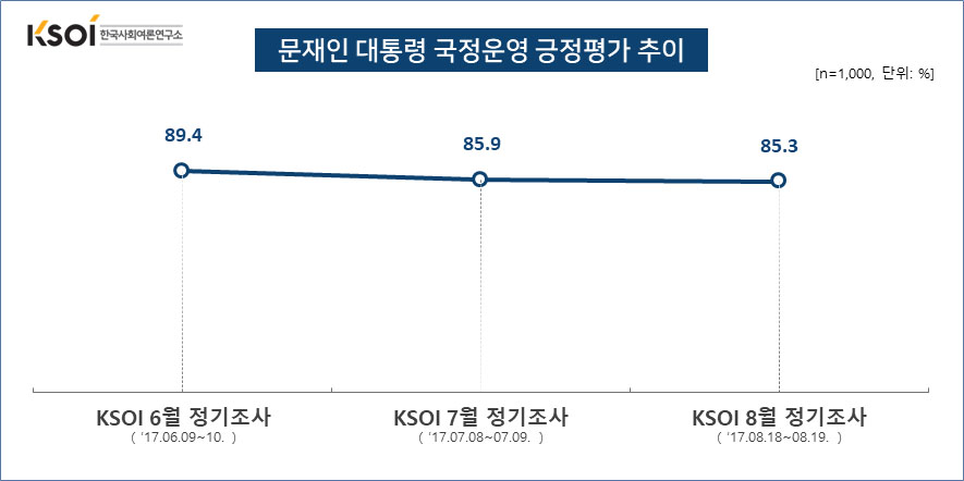 이는 최근 대북문제의 긴장감 고조와 ‘살충제 게란’ 논란에도 불구하고 지난 7월 한국사회여론연구소의 자체조사 결과인 85.9%과 거의 변화가 없었으며, 국정운영에 대해 긍정적인 평가가 여전히 높은 것으로 조사되었다.