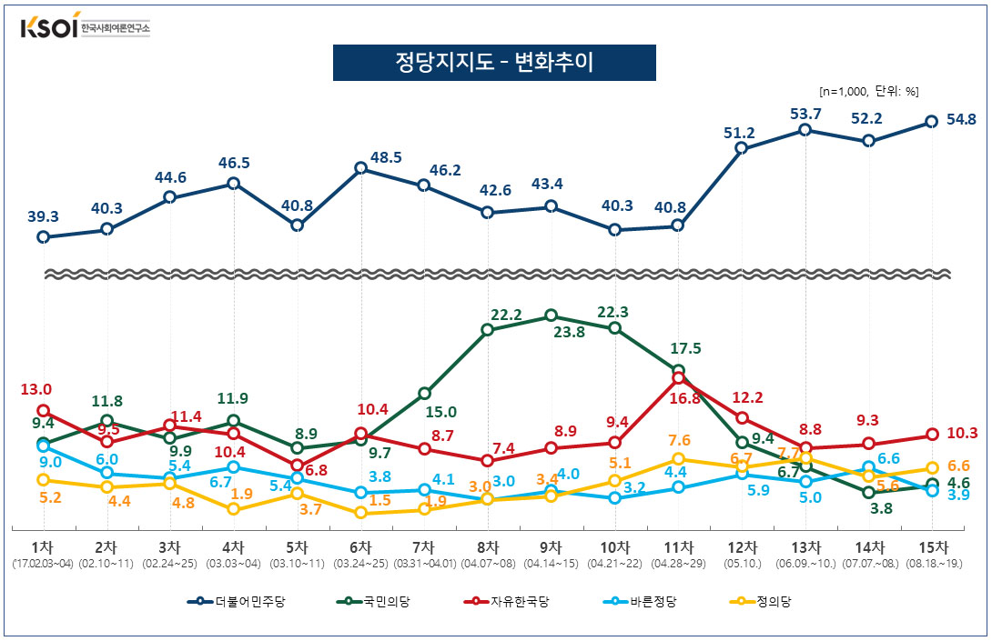 더불어민주당이 지난 7월 한국사회여론연구소 정례여론조사 결과에 비해 2.7%P 상승한 54.8%로 지지도 1위 자리를 굳건히 지키고 것으로 나타났다.