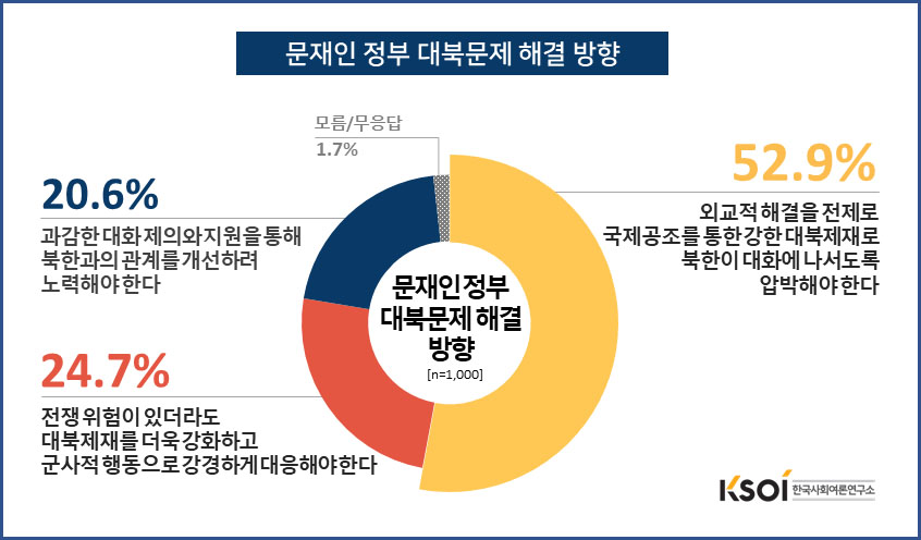 한국사회여론연구소(KSOI)가 지난 10월 13~14일 양일간 전국 만 19세 이상 성인남녀 1,034명을 대상 전화면접방식으로 실시한 여론조사에서 문재인정부의 대북문제 해결을 위한 방향으로 ‘외교적 해결을 전제로 국제 공조를 통한 강한 대북제재로 북한이 대화에 나서도록 압박해야 한다’는 의견이 52.9%인 것으로 나타났다.