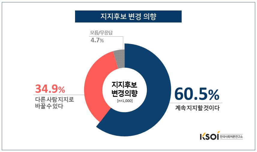 - 계속 지지할 것이다 60.5% (6.0%P↑) > 다른 사람 지지로 바꿀 수 있다 34.9%(4.6%P↓)