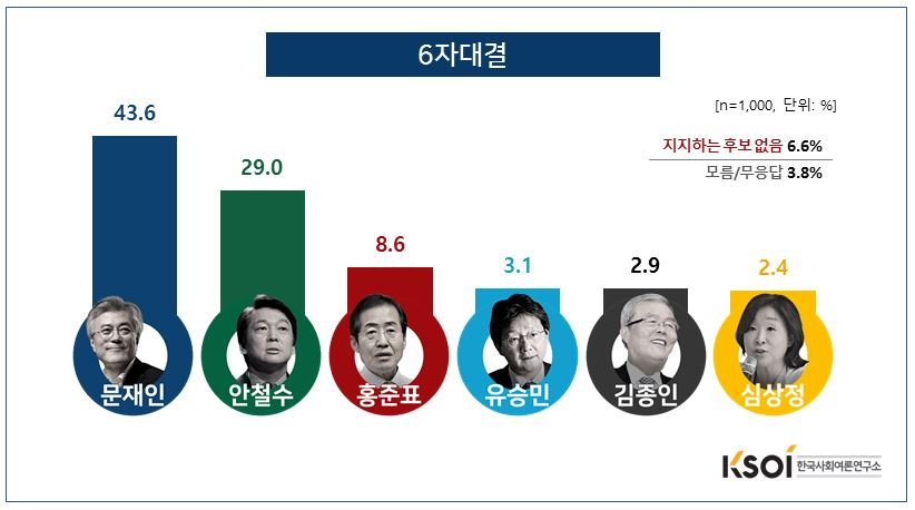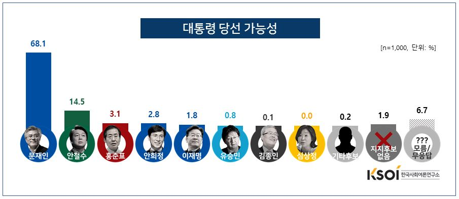 - 안철수 14.5%, 홍준표 3.1%, 안희정 2.8%, 이재명 1.8%, 유승민 0.8%, 김종인 0.1%, 심상정 순