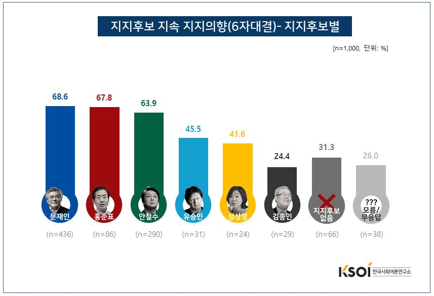 - 6자대결시 문재인 지지층 68.6% , 홍준표 지지층 67.8%, 안철수 지지층 63.9%, 유승민 지지층 45.5%, 심상정 지지층 41.6%, 김종인 지지층 24.4%‘계속 지지할 것’