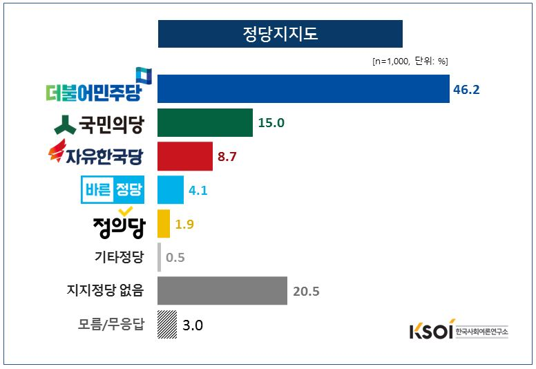 □ 정당 지지도, 더불어민주당 46.2%로 1위
