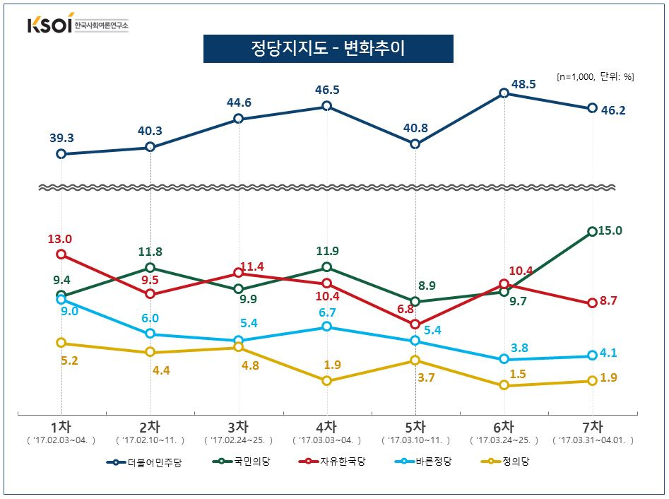 한국사회여론연구소(KSOI/http://www.ksoi.org)가 지난 3월 31일~4월 1일 이틀동안 전국 유권자 1016명을 대상으로 실시한 정당후보자간 가상대결에서 더불어민주당 문재인 후보가 43.6%의 지지를 받아 29.0%를 기록한 국민의당 안철수 후보를 14.6%P 격차로 앞서는 것으로 나타났으며, 적극적 투표참여의사층에서는 문재인 후보 47.3%, 안철수 후보 28.5%로 두 후보간 격차가 18.7%P로 확대되는 것으로 나타났다