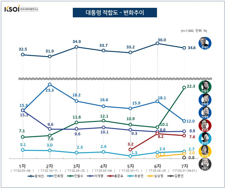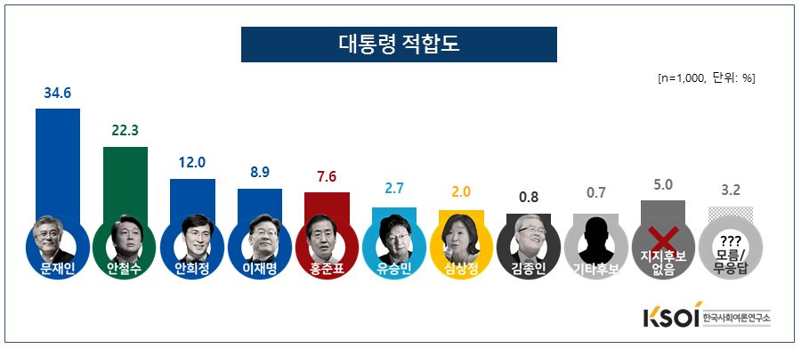 한국사회여론연구소(KSOI/http://www.ksoi.org)가 지난 3월 31일~4월 1일 양일에 걸쳐 전국 유권자 1016명을 대상으로 실시한 전화면접여론조사에서 5월 9일 실시되는 대통령선거에 출마를 선언한 인물들 중 차기 대통령에 가장 적합한 후보로 전체 응답자의 34.6%가 더불어민주당 문재인 후보를 선택해 7주 연속 1위를 지키고 있는 것으로 조사되었다.