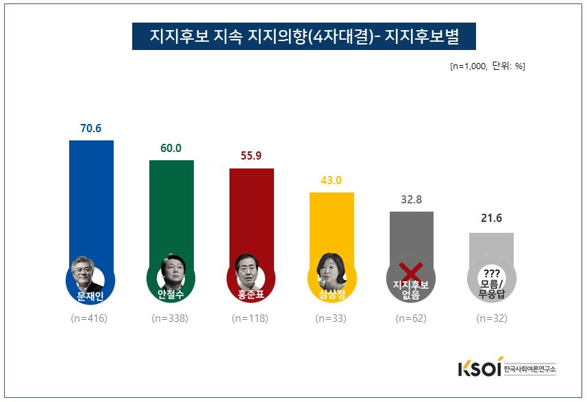 4자대결시에는 문재인 후보 지지층에서 ‘계속 지지할 것이다’라는 의견이 70.6%로 가장 높게 나타났으며, 다음으로 안철수 후보지지층 60.0%, 홍준표 후보 지지층 55.9%순으로 조사되었다.